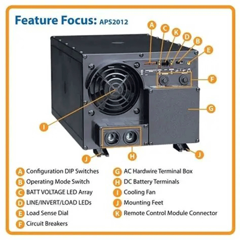 2000W APS INT Series 12VDC 230V Inverter/Charger with Auto Transfer Switching, Hardwired, DIP switches configure high and low voltage auto-transfer, 2000W continuous output power; 4000W peak power
