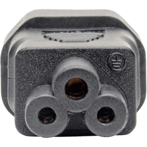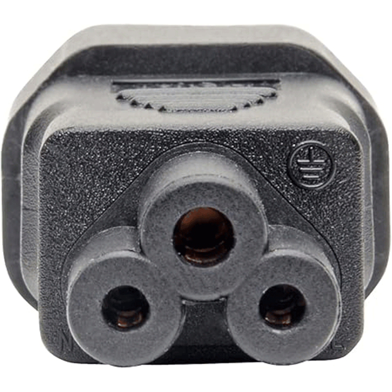 - Connector B (Receptacle): IEC 60320 C5 female — accepts a “cloverleaf” C6 plug (common on laptop power supplies).