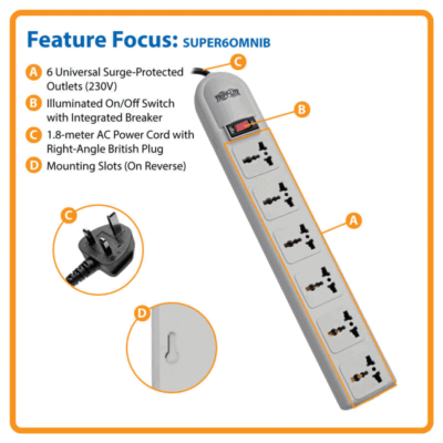Protect It! Extension Socket 230V 6-Universal Outlet Surge Protector, 1.8M Cord, British Plug, 750 Joules – Lifetime Warranty