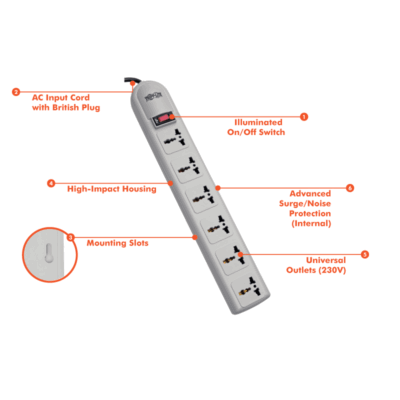 The Protect It! 230V 6‑Universal Outlet Surge Protector is a corded multi‑outlet strip designed to both expand the number of available sockets and protect connected equipment from damaging power surges and spikes on AC mains. It’s ideal for home and office use with computers, networking gear, printers, modems/routers, and other sensitive electronics.