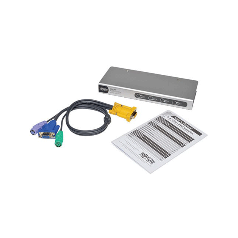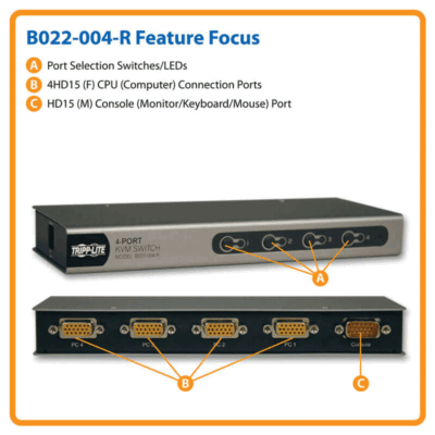 The Tripp Lite B022-004-R is a 4-port desktop KVM switch designed to let one user control up to four computers using a single keyboard, monitor, and mouse. It features plug-and-play installation, requiring no software, and supports both PS/2 and USB connections through compatible cable kits. Users can easily switch between connected systems using front-panel push buttons or keyboard hotkeys, making it ideal for IT workstations, labs, or multi-PC office setups.